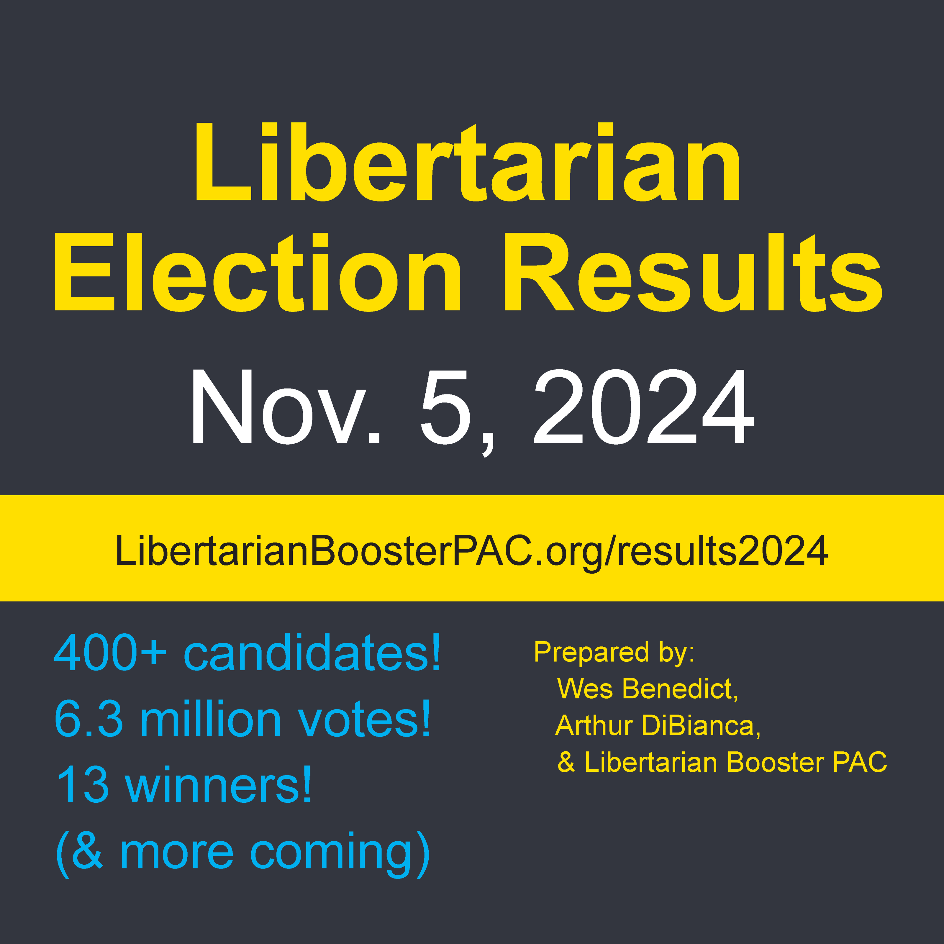 As of 11/7/2024, we show over 400 Libertarian candidates, over 6.3 million votes for Libertarians, and 13 winners!