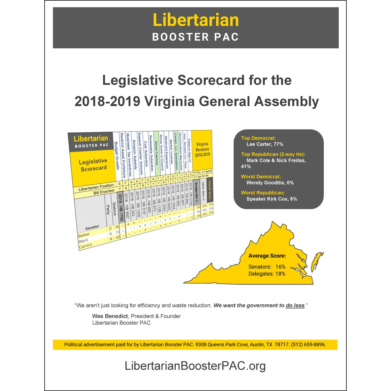 The Libertarian Booster PAC presents our ratings of the members of the 2018-2019 Virginia state legislature, the General Assembly, based on their votes on various bills.
