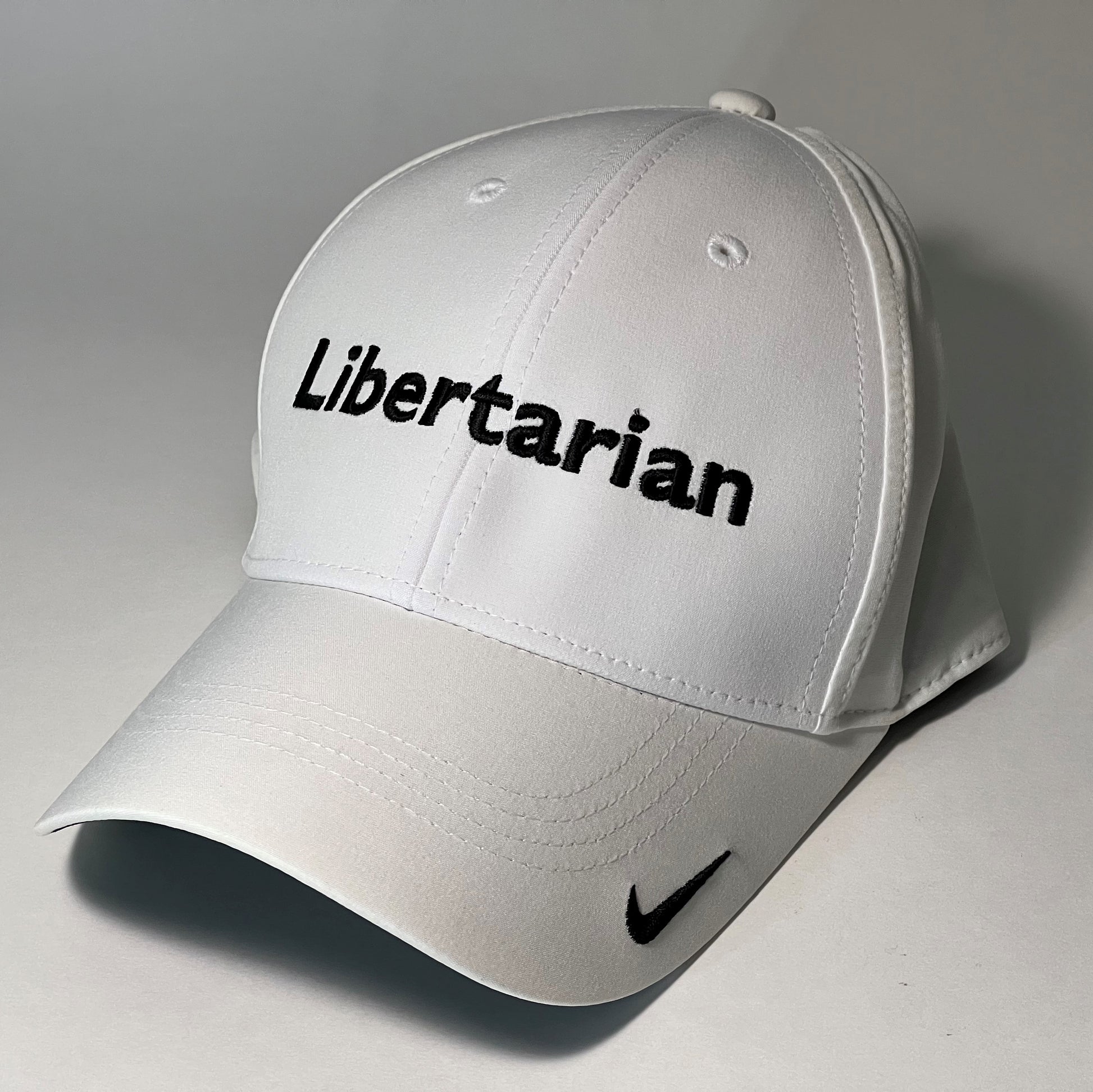 White hat with "Libertarian" embroidered in black on the front. No design on back. High quality Nike performance 90% Polyester/10% Spandex hat. Easy to clean and keep bright white!