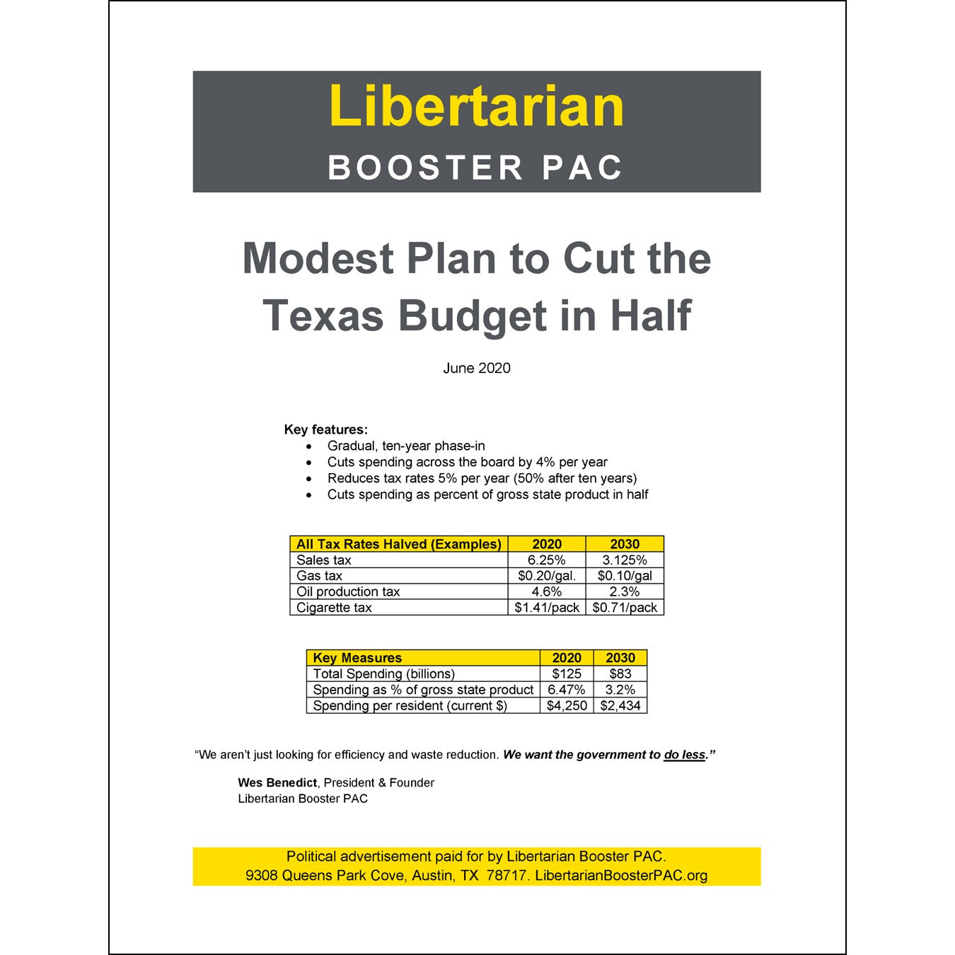 Our "Modest Plan to Cut the Texas Budget in Half." Lots of politicians talk about tax cuts, but practically no one ever shows how to cut spending. Our proposal shows how to cut the Texas budget in half (spending and taxes) over 10 years. Published in 2020. 10 pages.